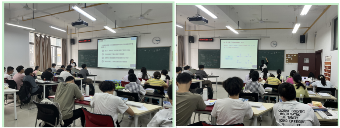 胡涛老师一直主讲《高分子化学》和《聚合物合成工艺学》两门课,曾获校第十七届青教赛二等奖,上课过程中善于将理论紧密联系实际,案例生动且贴近生活,同学们上课兴趣浓厚。“你们点外卖,奶茶杯、外卖餐盒,可能正用着阴离子聚合技术。”胡涛老师举起标注“PLA”的可降解饭盒,从环保餐具延展到聚乳酸合成工艺。当讲解活性聚合的“快引发、慢增长”特性时,她对比展示尼龙绳与橡皮筋的微观结构差异,用“拉面师傅揉面团”比喻分子链的精确控制,教室里响起一阵会意的笑声。